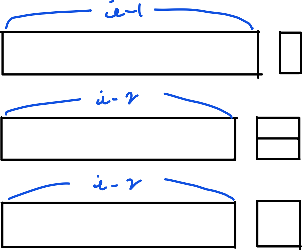 2) 왼쪽부터 i-2의 길이가 덮개로 이미 채워져 있으면 1*2 덮개를 2개 덮는경우, 2*2 덮개 하나를 넣는 경우로 2가지가 존재한다