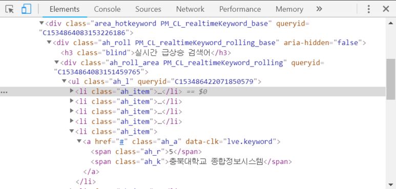 :네이버에서 f12를 누르고 개발자 옵션에서 실시간 검색어부분의 태그를 봅니다.