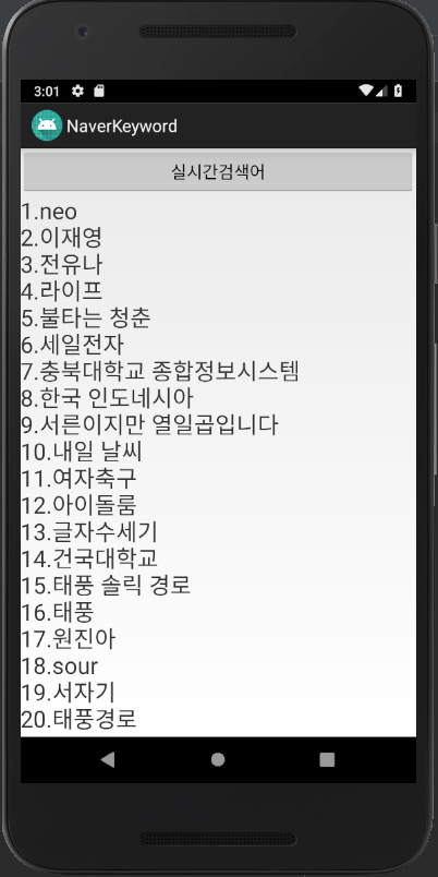 실시간 검색어를 클릭하면 네이버에서 실시간 검색어를 파싱해 와서 보여주도록 구현하였습니다.
