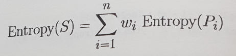 - 문제점은 분할 후에 데이터가 하나 이상의 파티션으로 나뉘는 점이다.=> Entropy(S2)를 계산하는 함수는 모든 파티션의 전체 엔트로피를 고려할 필요가 있다. => 각 파티션의 엔트로피에 파티션에 소속된 레코드의 비율에 따라 가중치를 부여한다.