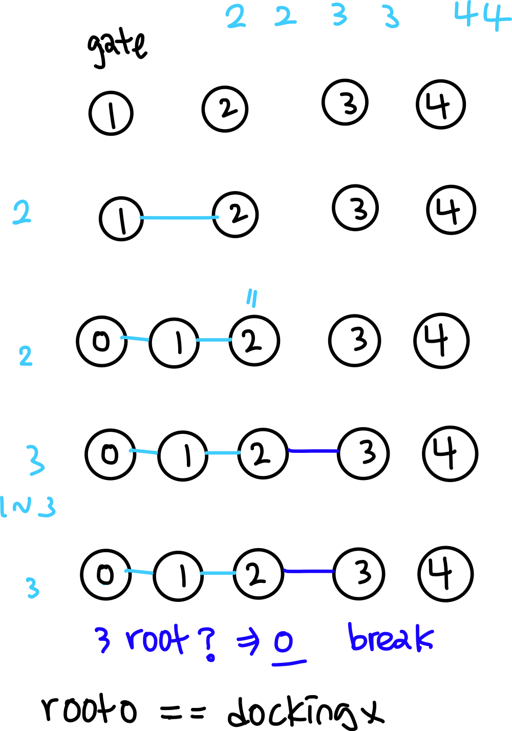 | - 도킹 = union연산 - 비행기가 순서대로 들어오면 차례대로 도킹을 수행해야하는데, 가능한 큰 번호의 탑승구로 도킹을 수행한다고 해보자 - 새롭게 비행기가 도킹 되면, 해당 집합을 바로 왼쪽 집합과 합친다. - 단, 집합의 루트가 0이면 더 이상 도킹이 불가능하다 ex) 입력2의 경우, 4는 탑승구의 개수, 6은 비행기의 수 1. 2 -> 첫번째 비행기는 1부터 2까지의 탑승구 중 하나에 도킹, 2번 노드를 확인하는데 2번 노드의 루트는 2이다. 그러므로, 1번과 union 2. 2 -> 두번째 비행기는 1부터 2까지의 탑승구 중 하나에 도킹할 수 있다. 2번 노드를 확인해보면 2번 노드의 루트는 1이다. 그러므로 1번노드와 0 번 노드 union 3. 3 -> 세번째 비행기는 1부터 3까지의 탑승구 중 하나에 도킹할 수 있다. 따라서 3번 노드를 확인해보면, 3번 노드의 루트는 3이다. 그러므로, 3번과 2번 union 4. 3 -> 네번째 비행기는 1부터 3까지의 탑승구 중 하나에 도킹할 수 있다. 하지만 3번 노드의 루트가 0이므로, 더 이상 도킹할 수 없음을 확인할 수 있다. |