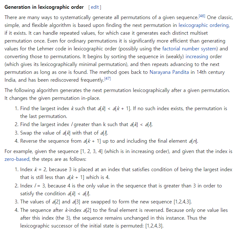 - 1 부터 n으로 이루어진 수 1) a[i] <a[i+1] 이 성립하는 인덱스 i의 최대값을 찾는다. 찾을 수 없다면 수열 a가 마지막항이다. 2) 인덱스 i보다 크고, a[i]보다 큰 것들 중 가장 먼 인덱스 j를 찾는다 3) a[i]와 a[j] 값을 교환한다 4) 인덱스 i이후 값들을 오름차순으로 정렬 ex) [ 3, 1, 4, 2] 1) 증가하는 마지막 인덱스를 찾음 a[1]=1 2) 1보다 큰 값중 가장 먼 인덱스는 4이다. a[4]=2 3) a[1]과 a[4]를 swap [3,2,4,1] 4) a[1] 다음의 숫자들을 오름차순으로 정렬한다 [3,2,1,4] ex) [ 1,2,3,4] 1) 증가하는 마지막 인덱스를 찾음 a[3]=3 2) 3보다 큰 값중 가장 먼 인덱스는 4이다. a[4]=4 3) a[3] 과 a[4] swap [1,2,4,3] 4) a[3] 다음의 숫자들을 오름차순으로 정렬한다. [1,2,4,3] ex) [5,4,3,2,1] 1) 증가하는 마지막 인덱스를 찾음 ,없음-> a가 마지막 수열이다. 이를 Narayana Pandita lexicographic ordering,라고 함 |